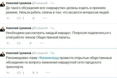 Глава региона Николай Цуканов призвал провести общественные обсуждения по вопросу изменения маршрутной сети в Калининграде и дал соответствующие рекомендации мэру города. Об этом губернатор написал в свое микроблоге во вторник.