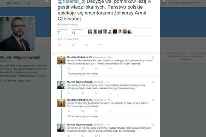 Отметим, что в «Твиттере» в переписку в Войцеховским вступили представители посольства России в Польше, которые заявили, что «памятники, а также кладбища охраняются в соответствии с межправительственным соглашением о могилах и памятниках жертвам войны и репрессий».