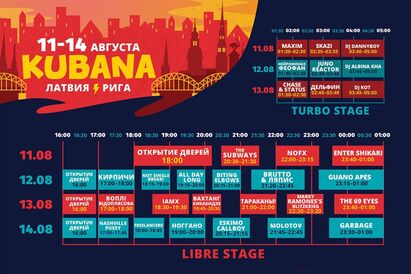 На официальном сайте музыкального фестиваля «Кубана», который во второй раз подряд пройдет в Риге, появилось полное расписание выступлений артистов с указанием дня и времени начала концерта, передает корреспондент «Афиши Нового Калининграда.Ru».