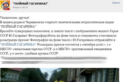 В Черняховске местным жителям вместо покемонов предложили ловить Юрия Гагарина. Как передает в пятницу корреспондент «Нового Калининграда.Ru», сообщение об этом размещено в социальной сети «ВКонтакте».