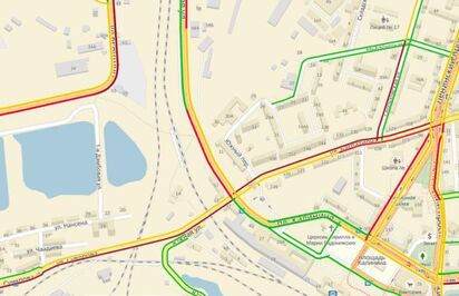 По данным сервиса «Яндекс. Пробки», скорость движения по улице Суворова в сторону города 3 км/ч, на выезд из города 5 км/ч. В пробках стоят улица Багратиона от пересечения с Ленинским проспектом и улица Суворова. Пробки образовались и на улице Портовой, там скорость движения 3 км/ч.