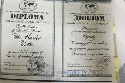 «Диплом доктора медицинских наук ему выдан Международной академией наук и искусств, аттестат профессора — Лазерной академией наук РФ, — рассказали сотрудники учреждения. — Мы проверили информацию об этих академиях, однако не нашли ничего, что подтверждало бы, будто подобные учреждения имеют право присваивать докторскую степень и профессорское звание». По словам сотрудников, Виктор Королев ушел в отпуск с последующим увольнением.