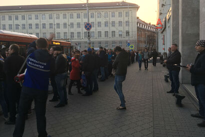 К шаттлам, отвозящим калининградцев на тестовый матч, выстроились большие очереди
