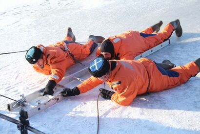 Спасатели при помощи бензопилы организовали на озере прорубь. Сотрудник МЧС, изображавший тонущего, продемонстрировал зрителям способы самостоятельного безопасного подъема на лед из воды. Затем спасатели показали, как это могут сделать пришедшие на помощь тонущему люди с помощью лестницы, спасательного круга, страховочных веревок и других специальных приспособлений.