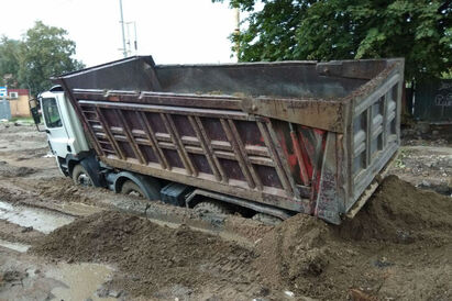 Ремонт улицы Киевской в областном центре осложняется сильными осадками, которые наблюдаются в последние дни. На перекрытом участке дороги в размокшем грунте застрял самосвал, передает корреспондент «Нового Калининграда».
