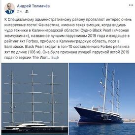 В порту Балтийска ошвартовалась яхта Black Pearl («Черная жемчужина»). Это лучший парусник 2019 года по версии The World’s Superyacht Awards. Об этом на своей страничке в Facebook* сообщил глава корпорации развития области Андрей Толмачев.