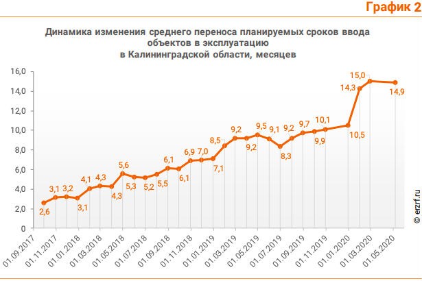 «Наибольший объем переносов планируемых сроков ввода объектов в эксплуатацию в пересчете на совокупную площадь жилых единиц приходится на переносы с 2019 на 2020 год (131 085 м²), что составляет 23,5% от общего объема планируемого ввода объектов в эксплуатацию в Калининградской области в 2020 году», — указано в отчёте ЕРЗ.