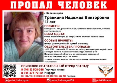 По информации организации, Травкина Надежда 14 июля около 06:00 вышла на работу кондуктором на рейсовом автобусе № 103 в п. Константиновка Гурьевского р-на. До настоящего времени её местонахождение не установлено