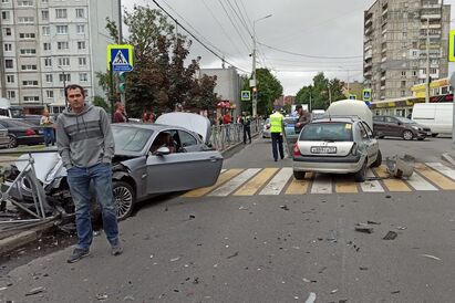 На записи видно, как автомобиль марки «Рено» пытается выполнить разворот на пересечении ул. Горького и Зеленой, но сталкивается с «БМВ». От удара вторую иномарку отбрасывает на пешеходный переход, она врезается в ограждение. Перед переходом в этот момент стояли люди, они успели отскочить и не пострадали.