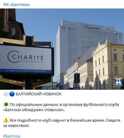 «По официальным данным, в организме футбольного клуба „Балтика“ обнаружен „Новичок“. Все подробности клуб озвучит в ближайшее время. Следите за новостями!» — говорилось в посте. В качестве иллюстрации была использована фотография берлинской клиники Charite, где находится на лечении российский оппозиционер Алексей Навальный.