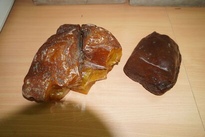 Вес добытых янтарных «тяжеловесов» составил порядка 2300 и 1150 граммов. Первый получил название «Стрелец». Он имеет неправильную форму близкую к треугольнику и острые края, а его палитра цветов простирается от золотистого с облачной дымкой до темно-медового. Самородок меньшего размера напоминает прямоугольник с закругленными краями. У него более однородная структура и почти гладкая поверхность темно-карамельного цвета. Ему присвоено имя «Кортеж».
