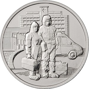 На оборотной стороне монеты 25 рублей изображены «два медицинских работника — женщина и мужчина — в защитных костюмах с реанимационными чемоданами на фоне здания медицинского учреждения и кареты скорой помощи». Тираж монеты — 5 млн штук.