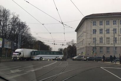 Одна из дорожных аварий случилась на перекрестке проспекта Мира с Советским проспектом. Там столкнулись автобус и автофургон, перекрывшие все полосы, ведущие с проспекта Мира в сторону площади Победы, и трамвайные рельсы.