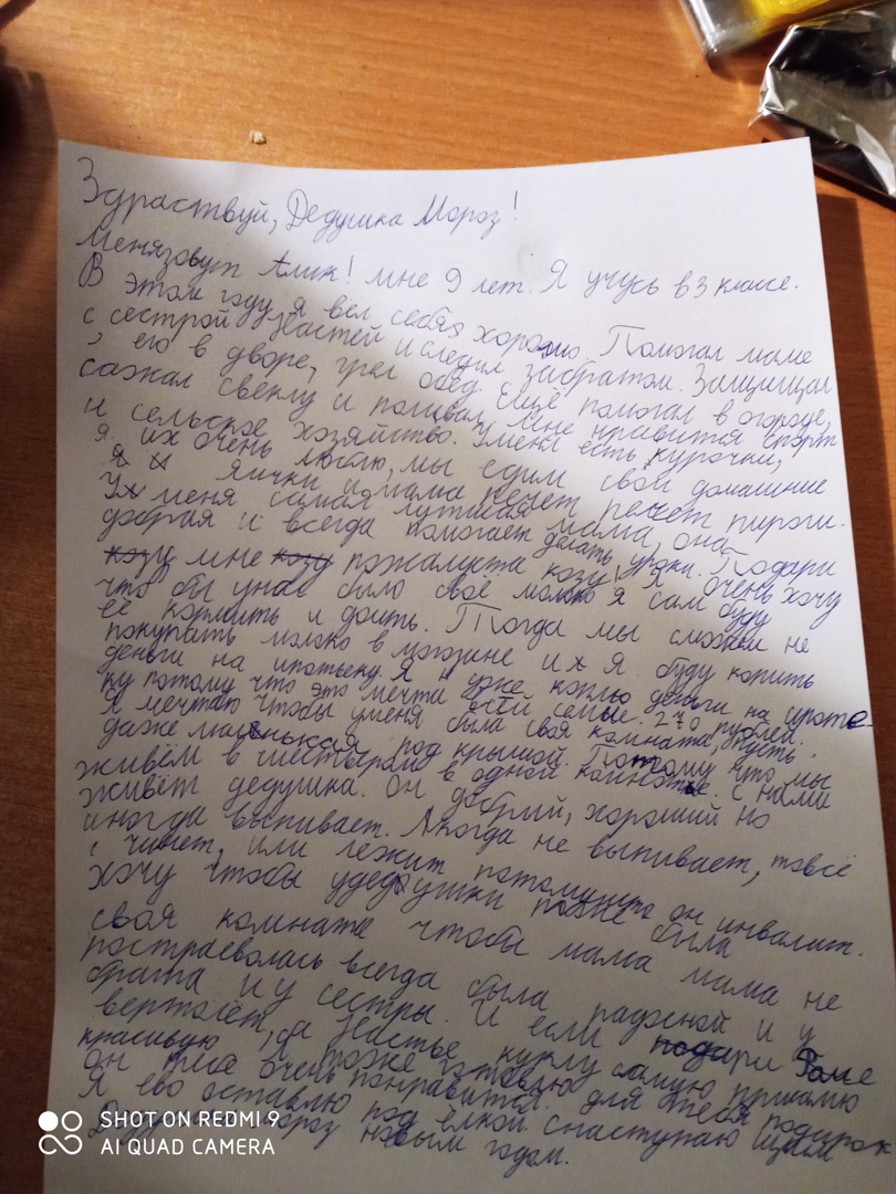 Дети уже начали писать письма со своими новогодними желаниями. Письмо третьеклассника Алика приводим целиком (орфография и пунктуация автора сохранены). Мальчик из многодетной семьи попросил Деда Мороза подарить ему козу, чтобы они могли накопить денег на ипотеку, поскольку сейчас вшестером ютятся в однокомнатной квартире.