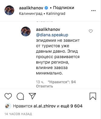 В комментариях к посту некоторые подписчики спрашивали губернатора о целесообразности ограничения туристического потока в область (такая мера властями не предлагалась). В ответ на это Алиханов написал, что эпидситуация внутри региона уже давно не зависит от завозных случаев коронавирусной инфекции.