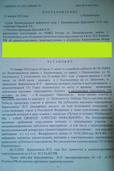 Полиция оценила количество участников шествия и митинга протеста в субботу, 23 января, в 350 человек. Такая цифра содержится в протоколах, составленных в отношении задержанных по итогам акции, их копии есть в распоряжении редакции «Нового Калининграда».