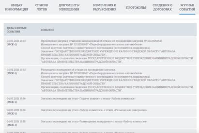 Извещение об отказе от проведения закупки было размещено в журнале событий в 17.33 МСК. В качестве причины отмены указано, что у заказчика «изменились потребности».