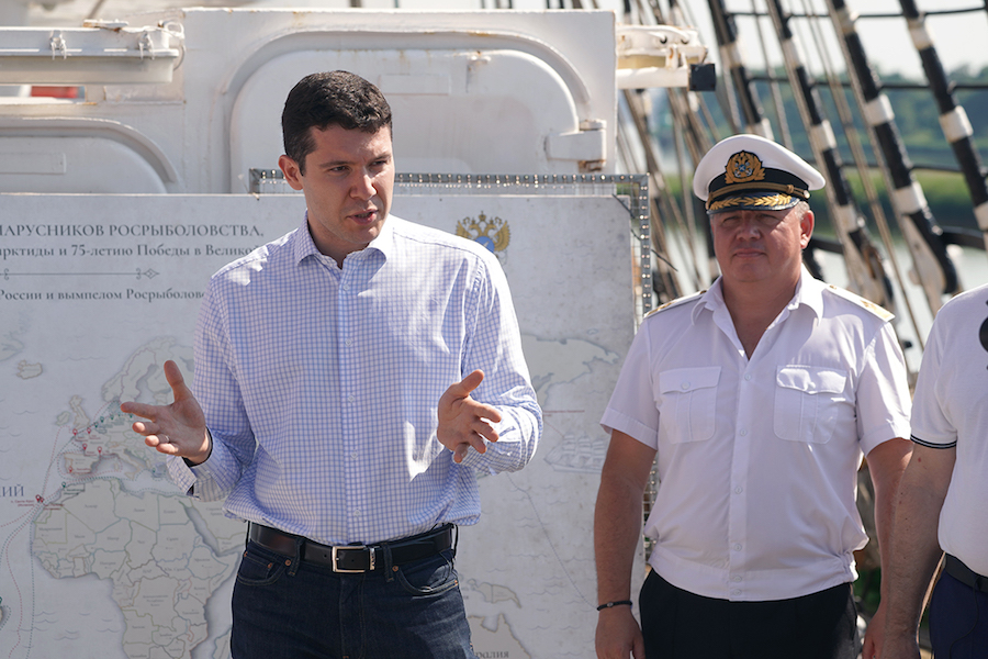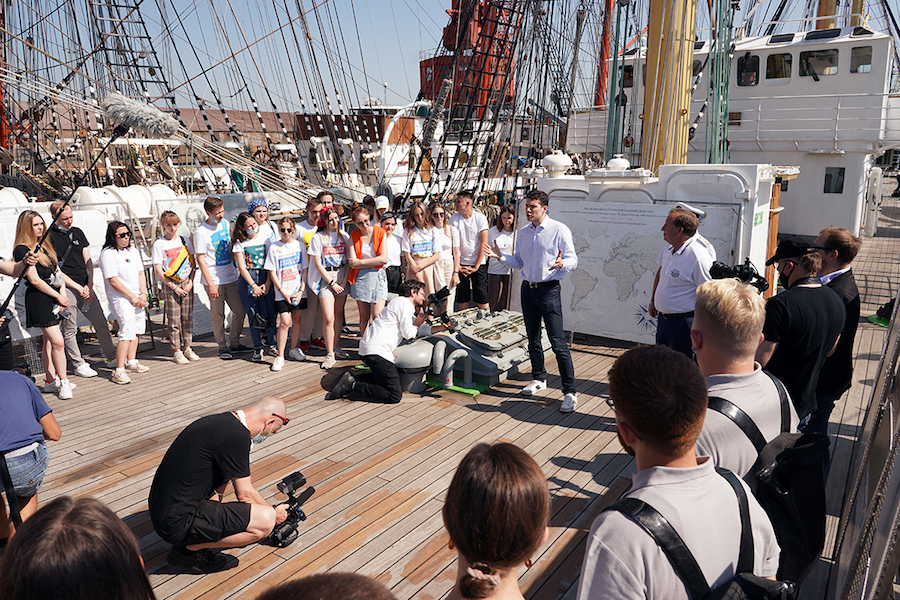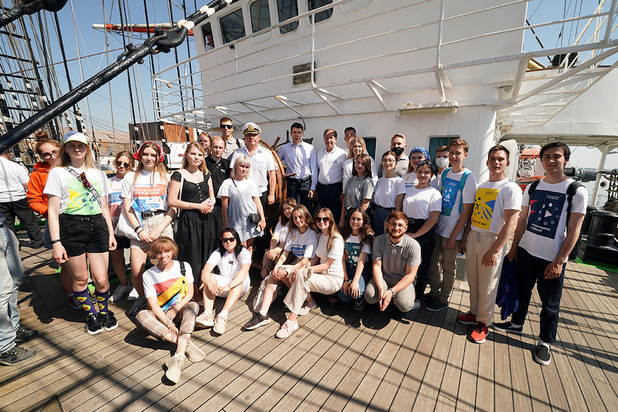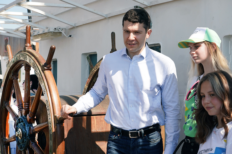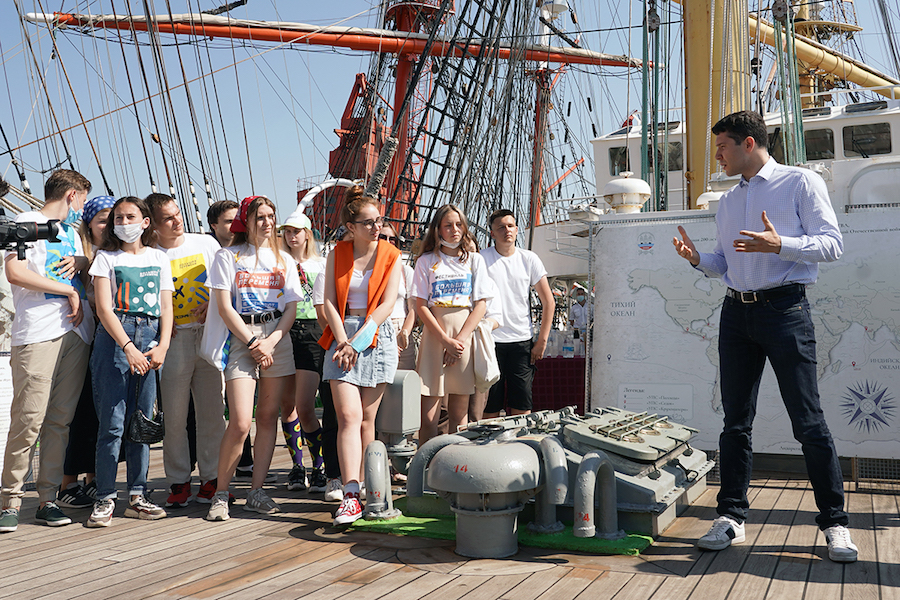 Губернатор Антон Алиханов провел экскурсию по барку «Крузенштерн» для школьников, ставших победителями конкурсов «Твой ход» и «Большая перемена». Об этом в воскресенье, 20 июня, сообщает пресс-служба областного правительства. Пресс-релиз сопровождается фотографиями, на которых лишь несколько человек — в масках.