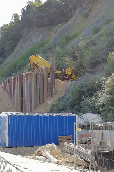 Судя по фото, ЧП случилось с самоходной копровой машиной, которая устанавливала шпунты для удержания склона (вдоль променада начато строительство двух зданий 5-этажного комплекса с апарт-отелем и медцентром). Пока установка лежит без движения, перевернуть ее обратно на гусеницы не пытаются: ситуация осложнена труднодоступностью этого места для тяжелой техники.