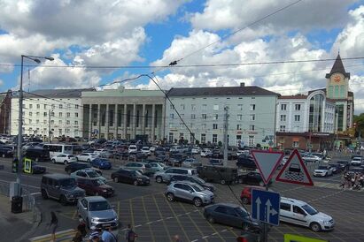 На это время участок Площади Победы около КДЦ станет односторонним. От Гаражной в сторону Советского проспекта проехать можно будет, в обратном направлении — нет.
