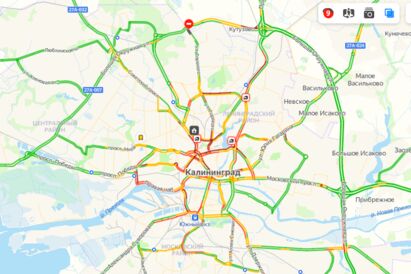 Вечером в четверг, 23 сентября, центр Калининграда встал в 9-балльных пробках. Об этом свидетельствуют данные сервиса «Яндекс.Пробки». Самая сложная ситуация сложилась на улицах Черняховского, Горького, Азовской, Театральной, Озерова, Советском, Гвардейском и Ленинском проспекте, площади Победы. Сервис сообщает по меньшей мере трех авариях: на ул. Черняховского, Московском и Советском проспектах.