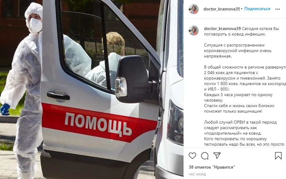 «Ситуация с распространением коронавирусной инфекции очень напряженная. В общей сложности в регионе развернуто 2 046 коек для пациентов с коронавирусом и пневмонией. Занято почти 1 800 коек, пациентов на кислороде и ИВЛ — 805! Каждые 3 часа умирает по одному человеку», — написала она, призвав своих подписчиков вакцинироваться.