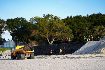 Работы по укреплению берега к западу от Зеленоградска, между границей города и речкой Алейкой, начали в конце сентября. По дюнам стала ездить и ровнять рельеф строительная техника. В местной администрации сообщили, что проект включает в себя работы по устройству коробчатых габионов и геопокрытия с целью удержания песка от эрозийного воздействия, а также высадку растений и деревьев, устойчивых к ветровым нагрузкам и удерживающих песок. На территории также запланировали обустроить 16 спусков к морю.