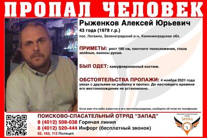 В Зеленоградском районе полиция, родственники и волонтеры разыскивают 43-летнего Алексея Рыженкова, который пропал еще 4 ноября. Об этом корреспонденту «Нового Калининграда» сообщили в ПСО «Запад».