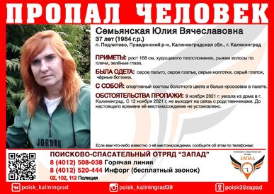 Если вам что-либо известно о местонахождении Юлии Семьянской, сообщите об этом по телефонам: 8 (4012) 508-038 — горячая линия ПСО «Запад», 8 (4012) 520-444 — инфорг ПСО «Запад», 02, 102, 112 — полиция.
