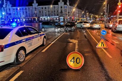 Происшествие случилось около 19 часов. 35-летний водитель «БМВ», поворачивая с ул. Черняховского направо, не справился с управлением, выехал на встречную полосу движения и столкнулся с ждавшими зеленого сигнала светофора «Фольксвагеном», «Хендэ» и «Хондой». В результате ДТП 62-летняя пассажирка автомобиля «Фольксваген» получила телесные повреждения.