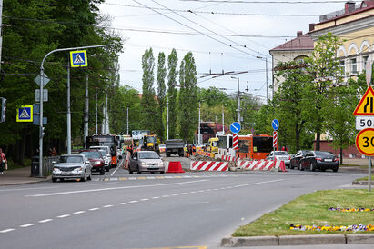 Рельсы перекладываются только на участке от драмтеатра до входа на стадион «Балтика». Ремонт привел к большим заторам. Запустить там трамвай (это будет восстановленный маршрут № 3, который свяжет Южный вокзал и Центральный парк) обещали к 9 мая, но сроки были сорваны: подрядчик не дождался многодневной очереди на границе и развернулся с грузом трамвайных рельсов. Пришлось заключать договор с новым и везти рельсы во второй раз.