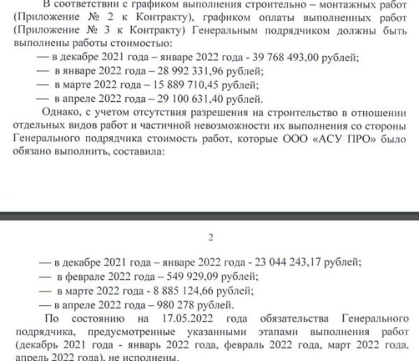 Как следует из документа, за декабрь-апрель фирма должна была исполнить обязательства на сумму 33,4 млн руб. «с учетом отсутствия разрешения на строительство в отношении отдельных видов работ и частичной невозможности их выполнения». «По состоянию на 17.05.2022 года обязательства генерального подрядчика (за указанный период — прим. „Нового Калининграда“) не исполнены», — говорится в претензии.