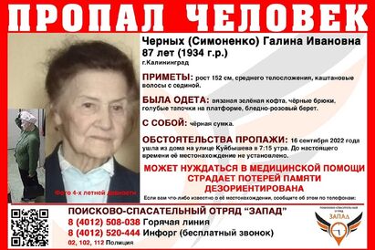 В Калининграде ищут 87-летнюю Черных Галину Ивановну, страдающую потерей памяти. Рано утром в пятницу женщина ушла из дома по ул. Куйбышева, и до настоящего времени ее местонахождение не установлено. Об этом сообщает ПСО «Запад» на своей странице «ВКонтакте».