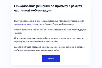 На портале Госуслуг появилась форма для обжалования решения о частичной мобилизации. Услуга предназначена для мобилизованных граждан, которые имеют основания для отсрочки, но всё равно были мобилизованы, говорится на сайте.