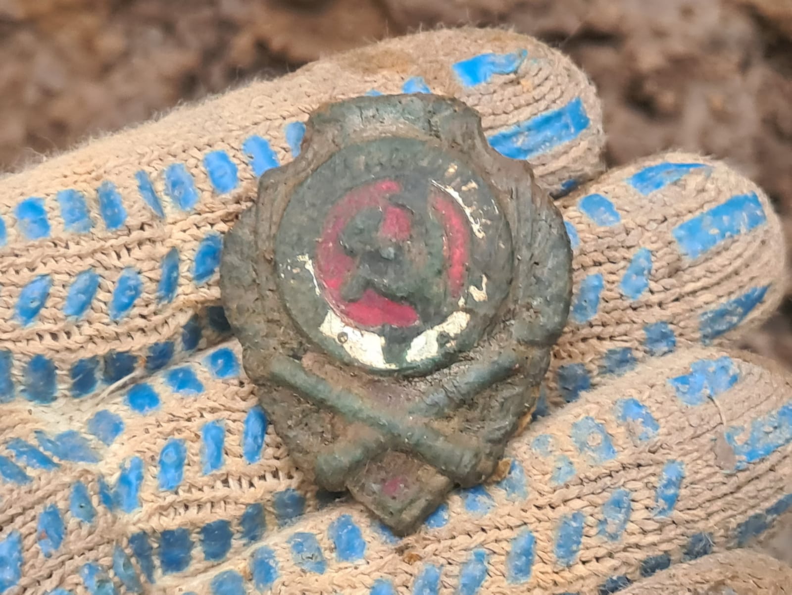 Найдены части военной амуниции, пуговицы, поясные ремни, ботинки, нагрудный знак «Отличный Артиллерист», орденская планка, монеты.