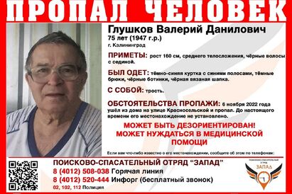 В Калининграде идут поиски 75-летнего Валерия Даниловича Глушкова, пропавшего в воскресенье, 6 ноября. Об этом сообщает Поисково-спасательный отряд «Запад» в соцсетях.