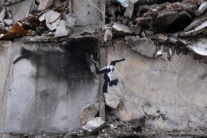 Британский уличный художник Бэнкси нарисовал граффити в Бородянке Киевской области Украины. Фото работы, выполненной на стене разрушенной многоэтажки, появилось на главной странице официального сайта артиста.