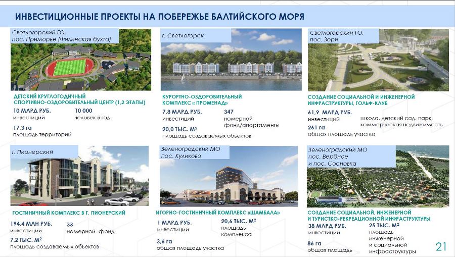 Всего планируют застроить 400 га побережья. В числе проектов, упомянутых в презентации губернатора — детский спортивно-оздоровительный центр в Филинской бухте (10 млрд рублей), курортно-оздоровительный комплекс на променаде в Светлогорске (7,8 млрд рублей), казино «Шамбала» в игорной зоне в Куликово (1 млрд рублей) и гостиничный комплекс в Пионерском (194,4 млн рублей).