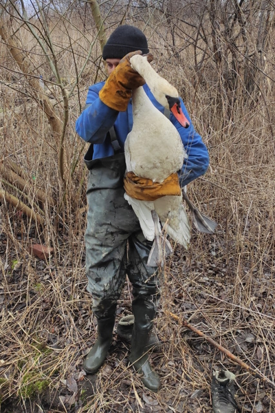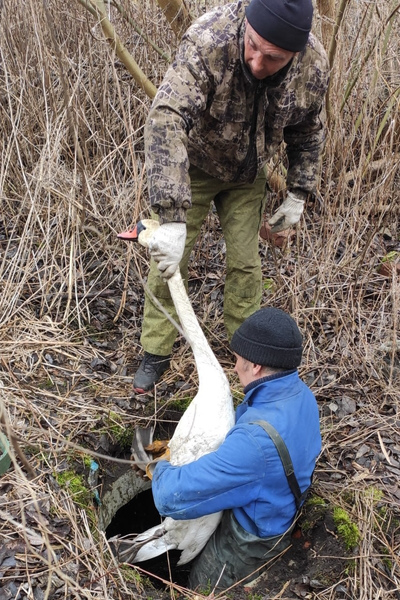 «Мы пошли проверять трассу, видим: шея белая торчит. Видимо, кто-то украл крышку люка, а лебедь шёл и туда...» — рассказал начальник местного водопроводно-канализационного участка Владимир Семиков.