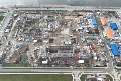 «В мае мы планируем начать возведение всем известной выносной консоли, параболоида так называемого, — добавил подрядчик. — Сейчас мы осуществляем поставку конструкций. Все контуры очертания зданий к осени, началу ноября-декабря мы будем видеть».