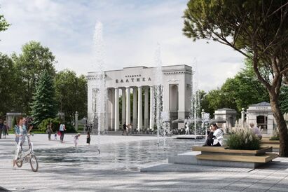По проекту фонтан предполагается сделать плоским в уровень с землей. Также нужно обустроить тротуары, газоны, клумбы, высадить деревья, установить скамейки, урны и т.д.