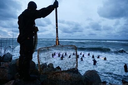 На берегу Балтийского моря туристка забирала янтарь из сачков старателей