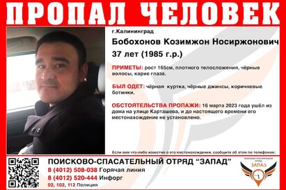 В Калининграде родственники, полиция и волонтеры разыскивают пропавшего без вести 37-летнего Козимжона Бобохонова. Об этом в среду, 22 марта, сообщает ПСО «Запад».