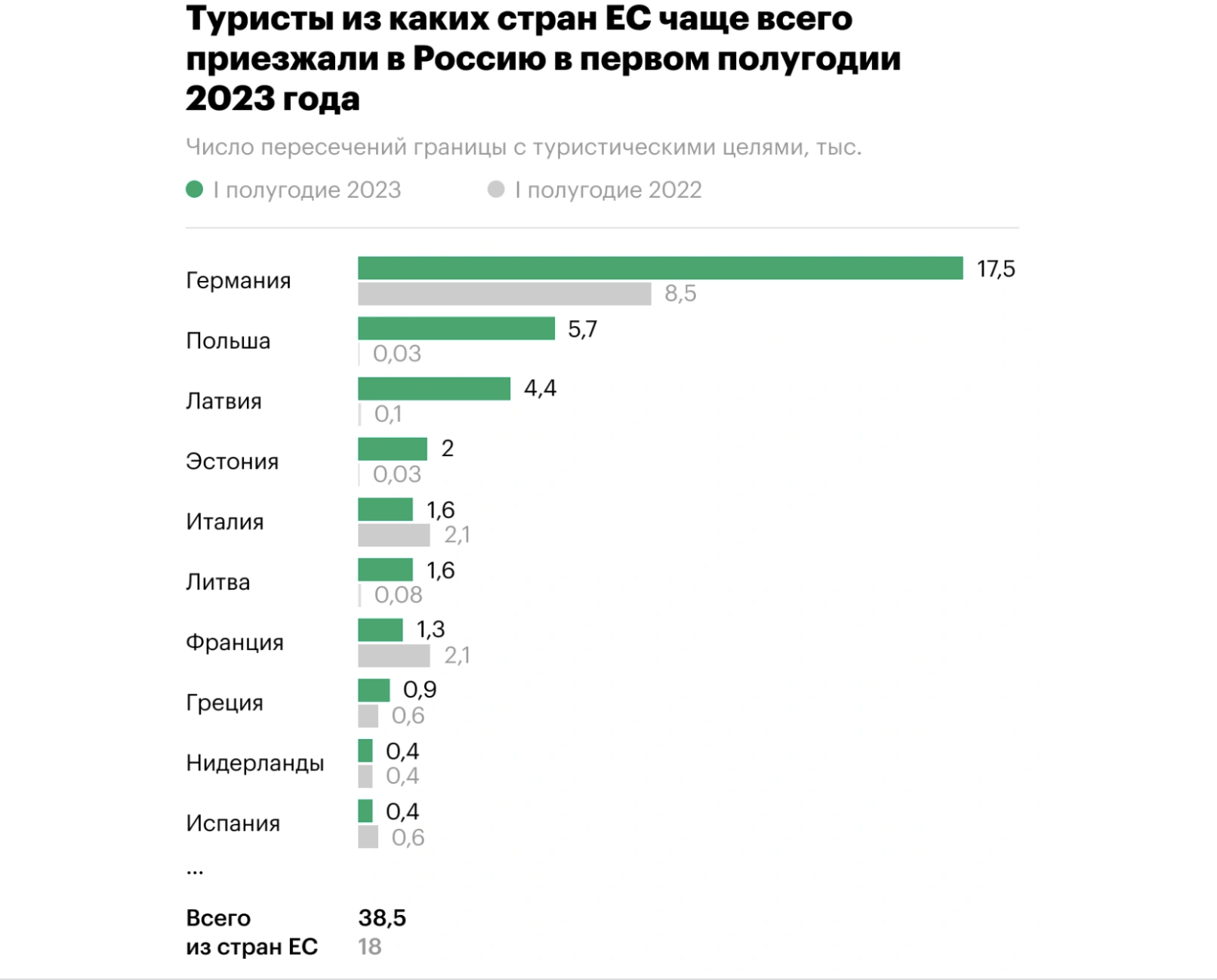 В РБК отмечают, что если брать только одну цель визита — туризм, то в лидерах окажется Германия. Оттуда в первом полугодии 2023 года въехали с туристическими целями в Россию 17,5 тыс. раз (8,5 тыс. в первом полугодии прошлого года). Далее следуют Польша и Латвия.