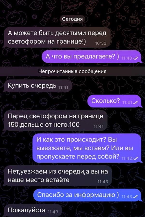 Судя по сообщениям, которые получают желающие выехать в направлении Польши, место у светофора предлагают купить за 150 евро, а более удаленные места — за 100 евро.