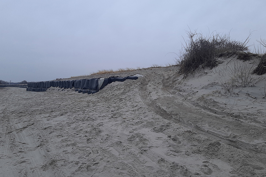 На торцевой стороне южной части авандюны зафиксированы локальные повреждения контейнеров «гео-бэг» в результате несанкционированного съезда автотранспорта с авандюны на пляж.