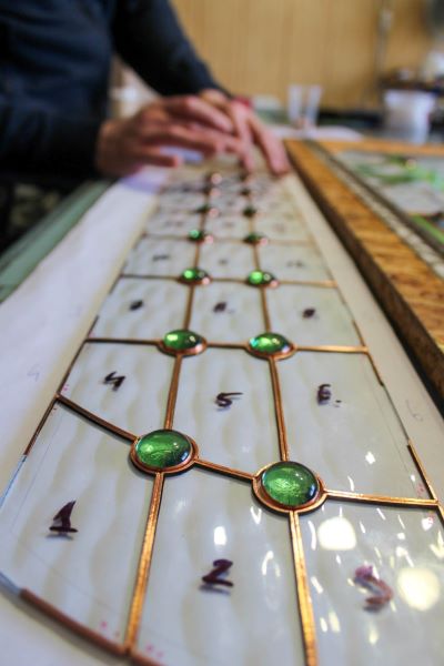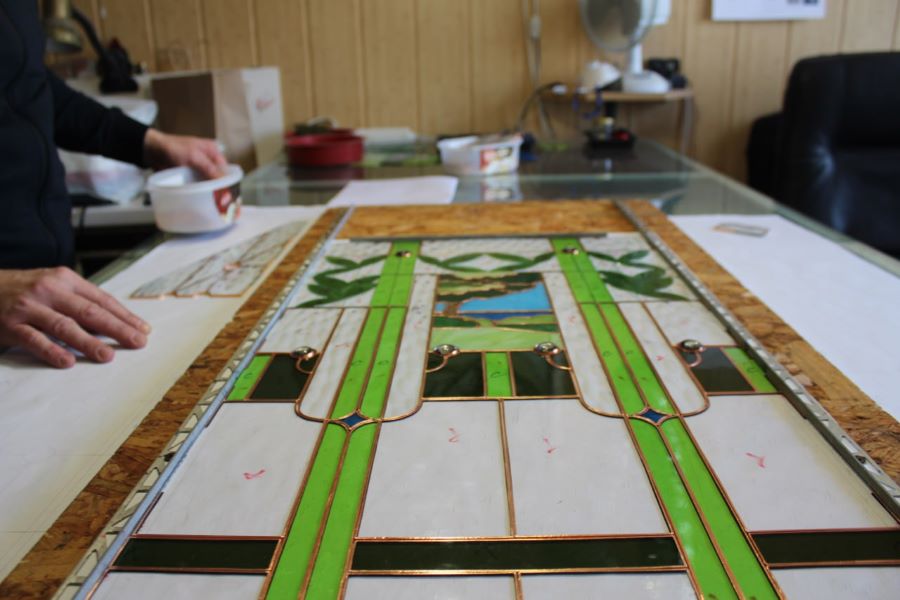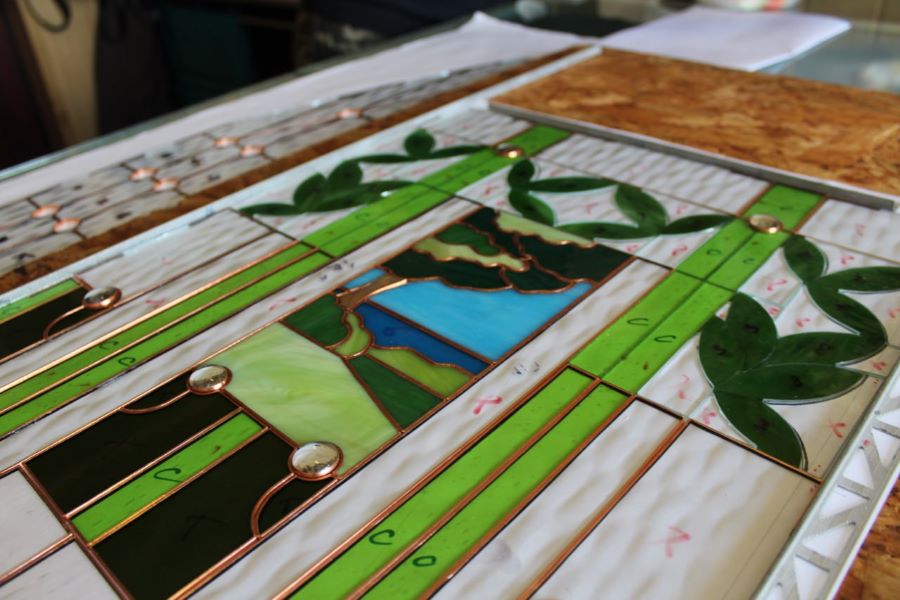 На стекле рисуют сюжет из произведения Александра Пушкина «Руслан и Людмила». Витражом занимается мастер Александр Полежаев.