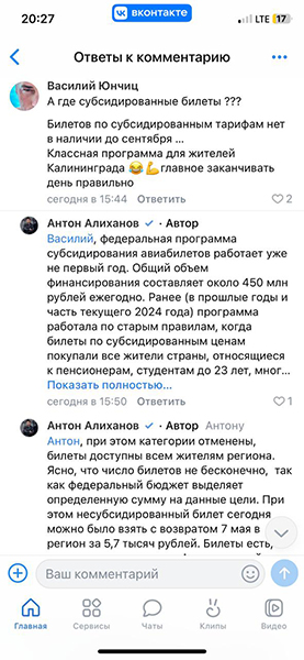 Губернатор Калининградской области Антон Алиханов напомнил жителям региона о том, что количество субсидированных авиабилетов «не бесконечно». Тему обсуждают в комментариях на странице главы региона «ВКонтакте».
