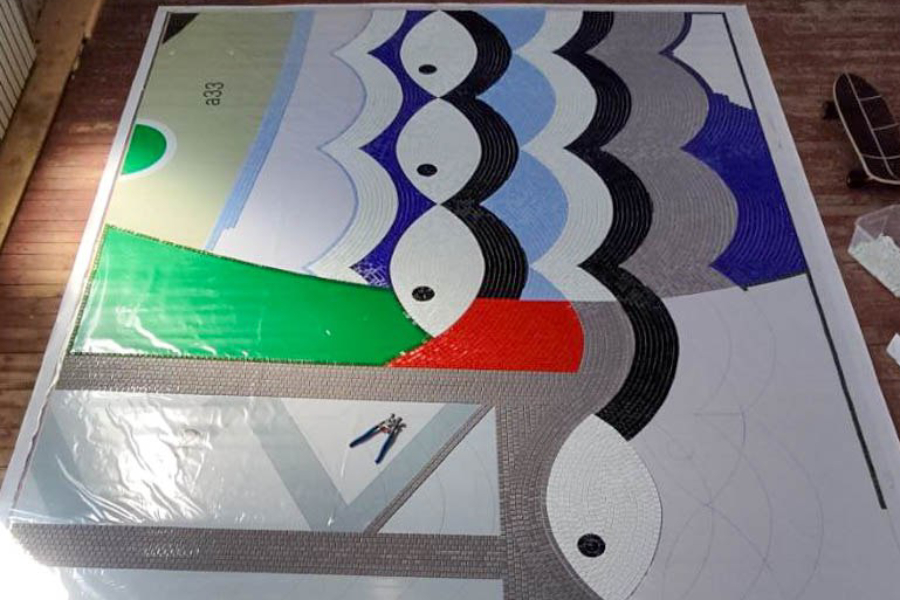 «Кстати, фактура на фото не будет соответствовать той, что мы увидим после монтажа. Паша работает обратным способом набора мозаики: гладкая лицевая сторона накладывается на поверхность эскиза», — делится подробностями реставрации Фонд.
