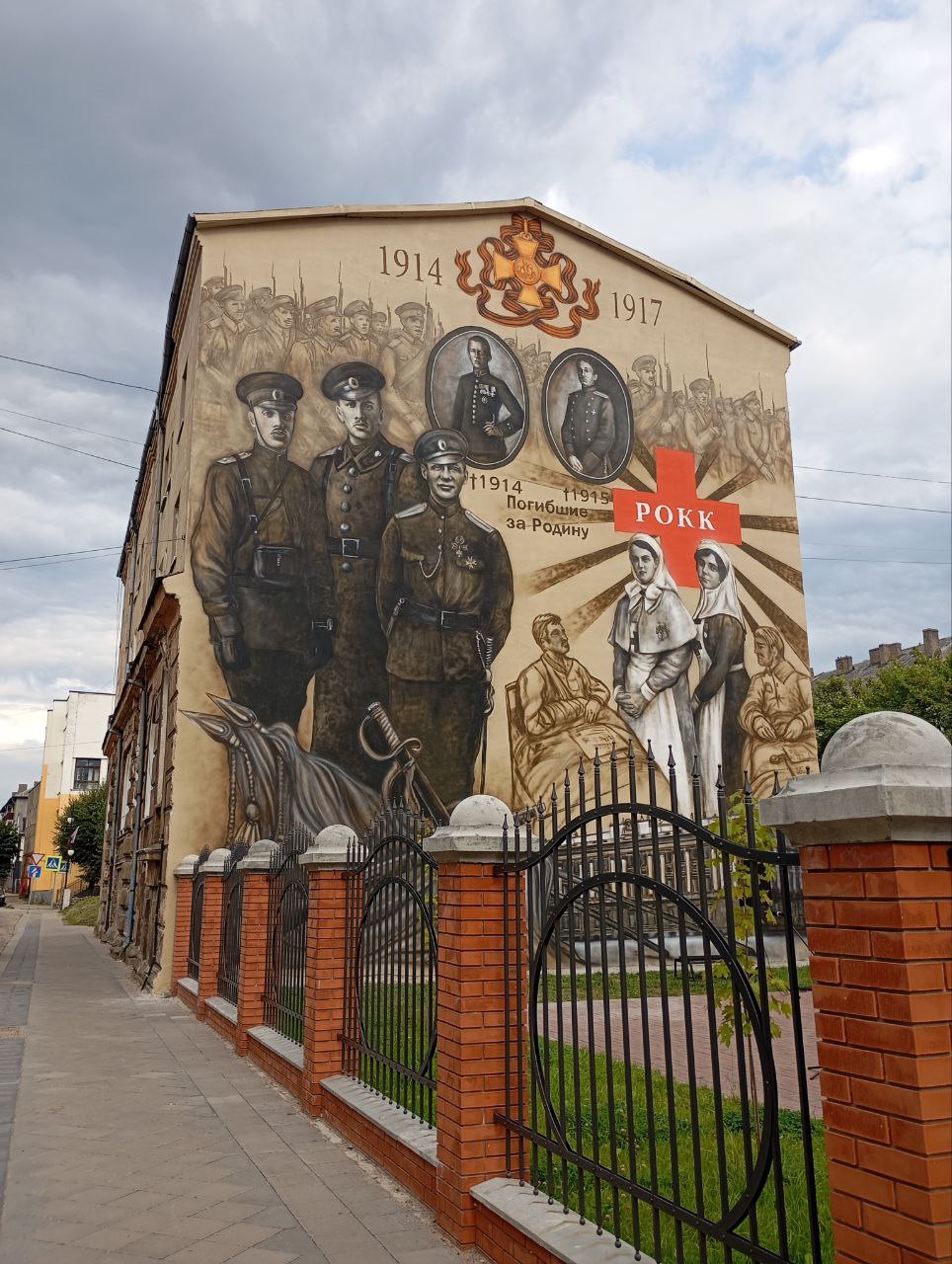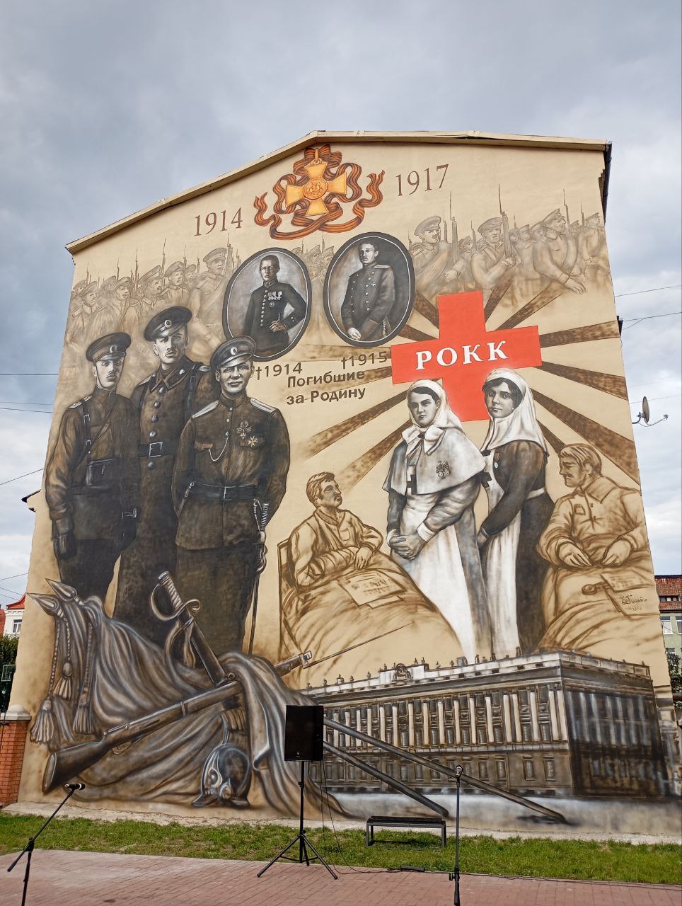 «На мурале запечатлены Князья крови императорской Константиновичи — Игорь, Иоанн, Гавриил, принимавшие участие в военных действиях в Восточной Пруссии, а также погибшие во время Первой мировой войны князь крови императорской Олег Константинович и князь Константин Багратион-Мухранский. Рядом, у постелей раненых воинов на фоне знака Российского Общества Красного Креста, изображены Августейшие сестры милосердия — Великая Княгиня Мария Павловна (младшая) и княгиня Елена Петровна Сербская, супруга Князя Крови Императорской Иоанна Константиновича, служившие в подвижном лазарете в Инстербурге (Черняховске) в сентябре 1914 года», — рассказал художник Евгений Клат. На создание мурала у него ушло 10 дней.